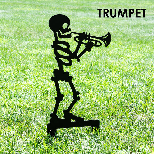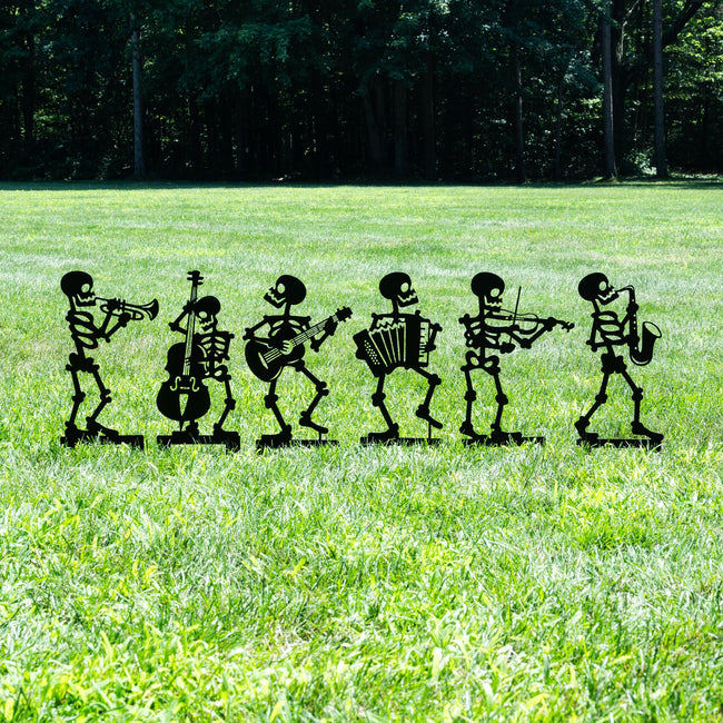 Strike up a spooky symphony this Halloween with these Musical Skeleton Yard Stakes! Each heavy duty metal skeleton plays a different instrument—choose from Bass, Guitar, Accordion, Trumpet, Violin, or Saxophone—or get the full band for a bold, unforgettable yard display. Made from premium quality steel and finished with a weather resistant powder coat, these yard stakes are perfect for outdoor use and come with attached stakes for quick, easy installation. Whether you showcase one solo skeleton or the full set for a festive graveyard jam session, these unique decorations bring fun and fright to any fall celebration.